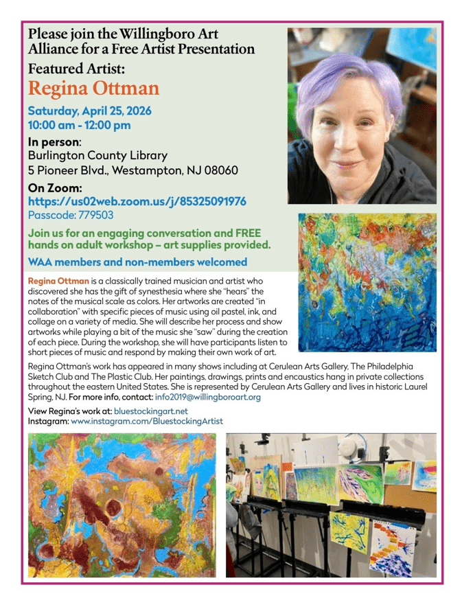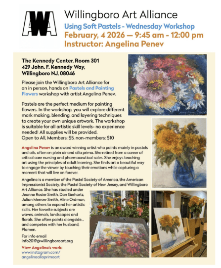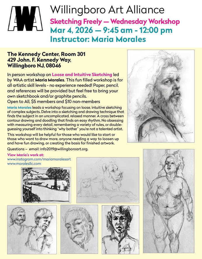 Each year, the Willingboro Art Alliance observes a brief summer break during July and August, during which some of our regular programming pauses. However, select sessions remain active to keep members connected and engaged. These include our Monday Life Open Studio (online with Marcia), Tuesday Open Studio (in-person with Arleen), and Thursday Online Open Studio (with Indira). While workshops and art coaching typically resume in September, members can still enjoy virtual presentations and recorded content available through our website and YouTube channel. We also continue to share opportunities from partner organizations and maintain communication through our Sketchbook Newsletter. Full programming resumes in early September, and we encourage everyone to check the Events Calendar and reach out with any questions during the summer months.
